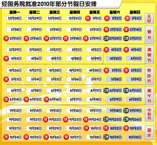 當(dāng)前位置:首頁(yè) > 網(wǎng)站舊欄目 > 學(xué)習(xí)園地 > 娛樂(lè)新聞 > 2010年中秋國(guó)慶假期時(shí)間安排 一個(gè)月分8斷(圖)