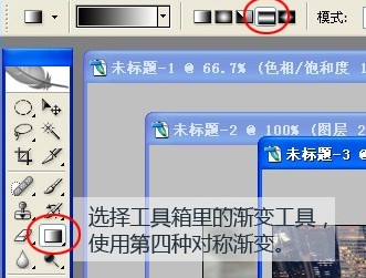 3.使用工具箱里的漸變工具,選擇第四種對稱漸變。