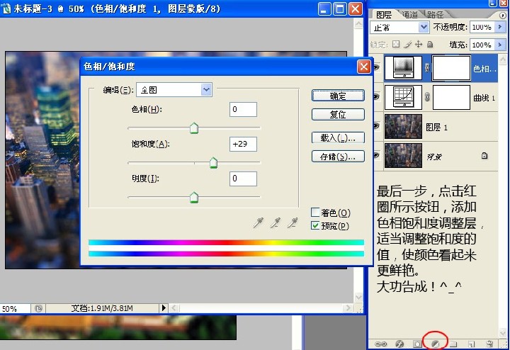 9.最后一步,點擊紅圈所示按鈕,添加色相飽和度調整層,適當調整飽和度的值,使顏色看起來更鮮艷。