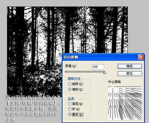 3.再對圖層1執行菜單命令“濾鏡”→“模糊”→“徑向模糊”,如下圖設置參數,把模糊的中心點左鍵拖動到左上角。