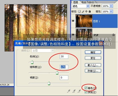 如果想把光線調成橙色,可以對圖層1執行菜單命令“圖像”→“調整”→“色相飽和度”命令,如下圖設置參數就可以啦!
