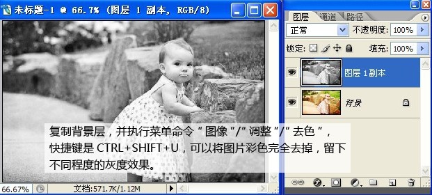 復制背景層,并執行菜單命令“圖像”→“調整”→“去色”,快捷鍵Ctrl+Shift+U,可以將圖片彩色完全去掉,留下不同程度的灰度效果。