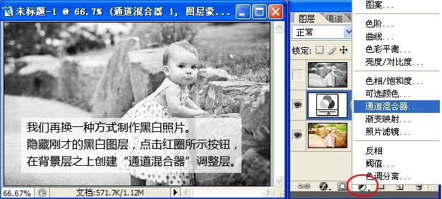 我們再換一種方式制作黑白照片。隱藏剛才的黑白圖層,點擊紅圈所示按鈕,在背景層之上創建“通道混合器”調整層。