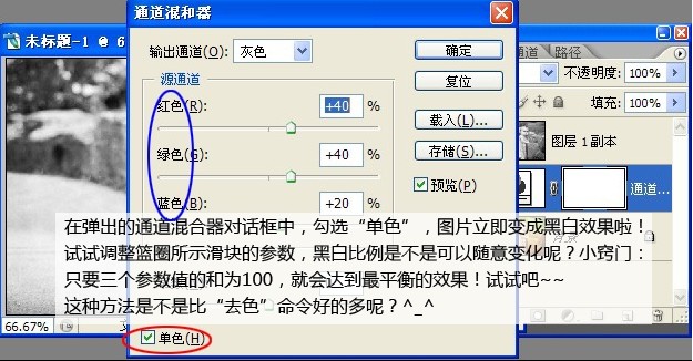 在彈出的通道混合器對話框中,勾選“單色”,圖片立即變成黑白效果啦!試試調整下圖藍圈所示滑塊的參數,黑白比例是不是可以隨意變化呢?