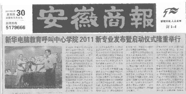 《安徽商報》報道:新華電腦教育呼叫中心學院2011新專業(yè)發(fā)布暨啟動儀式隆重舉行