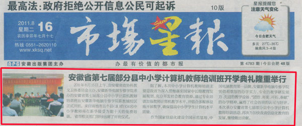 《市場新報》報道:安徽省第七屆部分縣中小學計算機教師培訓班開學典禮隆重舉行