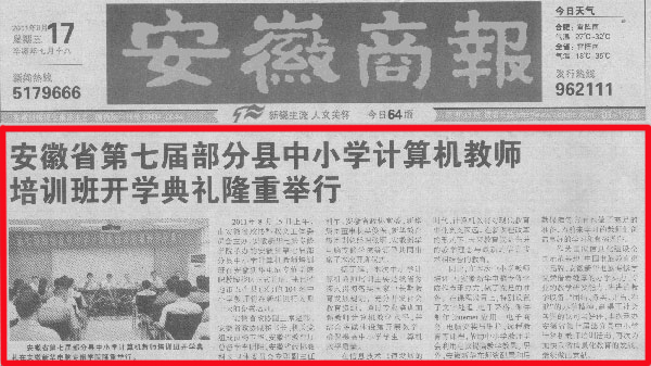 《安徽商報》報道:安徽省第七屆部分縣中小學計算機教師培訓班開學典禮隆重舉行