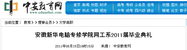 近日,安徽新華電腦專修學院網絡工程系2011屆畢業生畢業典禮在多媒體中心舉行。院領導、網絡工程系負責人、兄弟系部領導出席了本屆畢業典禮,近200名畢業生參加了莊嚴而隆重的畢業慶典。