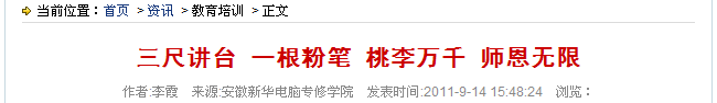2011年9月10日,在這秋高氣爽四處洋溢著收獲氣息的季節(jié),第二十七屆教師節(jié)如約而至,安徽新華電腦專修學院內笑聲不斷,原來學生在教師節(jié)的當天自發(fā)站成一排,為辛勤耕耘的每位老師送上溫情的康乃馨,老師們臉上洋溢著幸福的微笑,教師節(jié)也彌漫著喜慶的氣息。