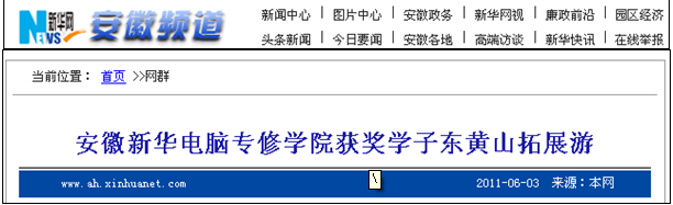 新華網訊:5月28日-29日,安徽新華電腦專修學院為期兩天一夜的東黃山拓展游活動圓滿結束。據悉,此次東黃山拓展游,是由美國CIW獨家贊助,為激勵該學院14名學子在第七屆校園數字文化節競賽獲得一等獎專門設立的一個獎項。