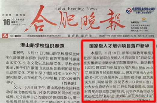 合肥晚報報道:《國家新職業技能人才培訓項目落戶新華電腦教育集團》