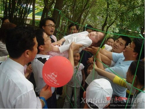 四.詳細游戲規則:在兩棵樹之間用繩子織起的網,有大小形狀都不規則的十九個洞口,假想為有高壓的網絲,在規定的時間內,隊員要互相配合在不碰觸到網子的情況下全部穿過去,并且穿過的洞口不能再過人,而碰到“高壓網”就表示任務失敗,需要重新再來。在接到任務后,隊長和隊員充分發揮大家的智慧,廣納建議,制定穿越計劃,共同協商協作,把每個人或抬著或扛著安全送過網洞,每次的成功換來的是大家的歡呼雀躍,最后所有的隊員都順利穿過了“生死網”。