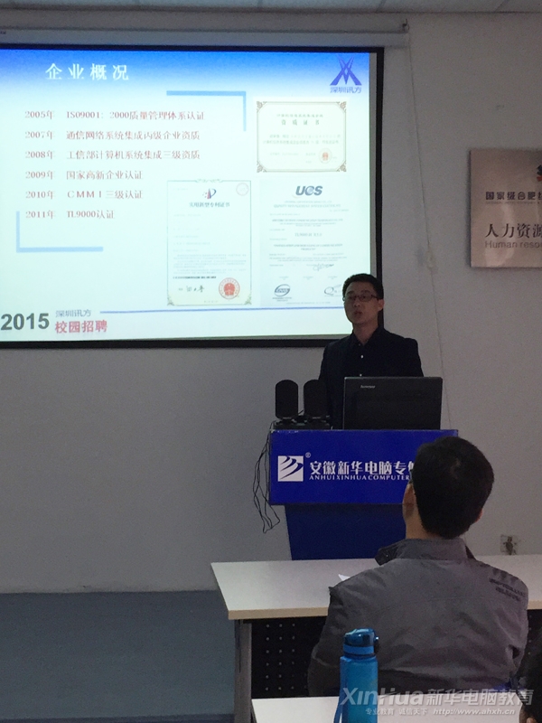 安徽新華電腦專修學院是國家信息化教育全國示范基地、中國電腦教育十大影響力品牌院校,主要從事廣告設計、裝飾設計、電子商務、軟件開發、網絡工程、動漫游戲、數碼影視、信息工程等計算機應用專業的教育。 近年來著重加強專業技術和管理人才隊伍建設,提升教育教學管理水平,本著以加強學生專業技能與實際動手能力為宗旨,結企業對人才的需求,全面制定卓有成效的教學計劃進行教學工作,培養學子們的專業技能、實際動手能力;同時對我院畢業生在職業規劃、綜合素養等方面都得到了全面提升,德才兼備的培養模式,得到很多企業的青睞與認可, 2014年10月,深圳市訊方通信技術有限公司慕名前往我院進行了優秀畢業生的選拔招聘。