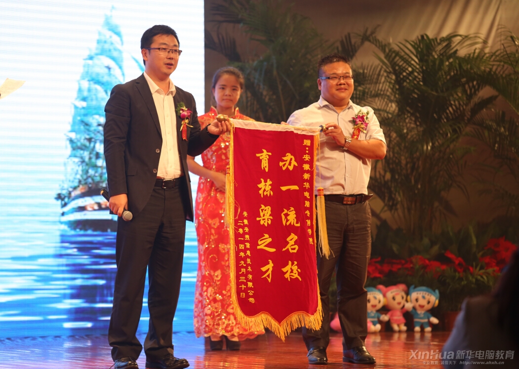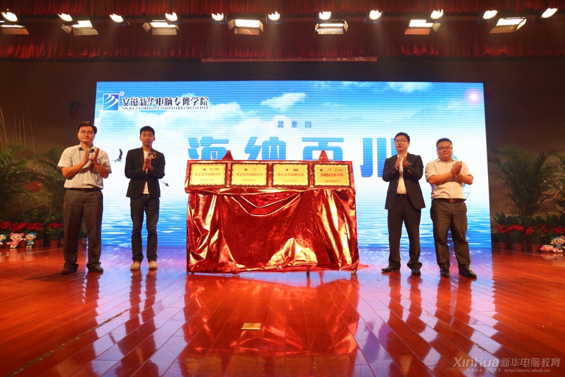 近年來,安徽新華電腦專修學院為培養出應對社會需要的高素質,技能型人才,在深化教學改革的同時,持續加大專業實訓室的建設力度,重點打造了廣藝、環藝、動漫實訓室,以及電子商務實訓中心和大學生創業基地,并和上千家優秀企業建立了良好的校企合作關系。而在今天這樣一個特殊日子,奇虎360安徽營銷服務中心、安徽創藝裝飾工程有限公司等優秀企業代表來到安徽新華開學典禮現場,為校企合作正式揭牌;奇奇虎360全國渠道中心華中大區總監周鵬為安徽新華電腦專修學院贈送錦旗。