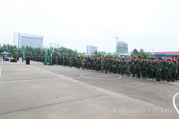 在嘹亮的軍歌之中,安徽新華電腦專修學院副院長孫禮平飽含激情宣布軍訓開始