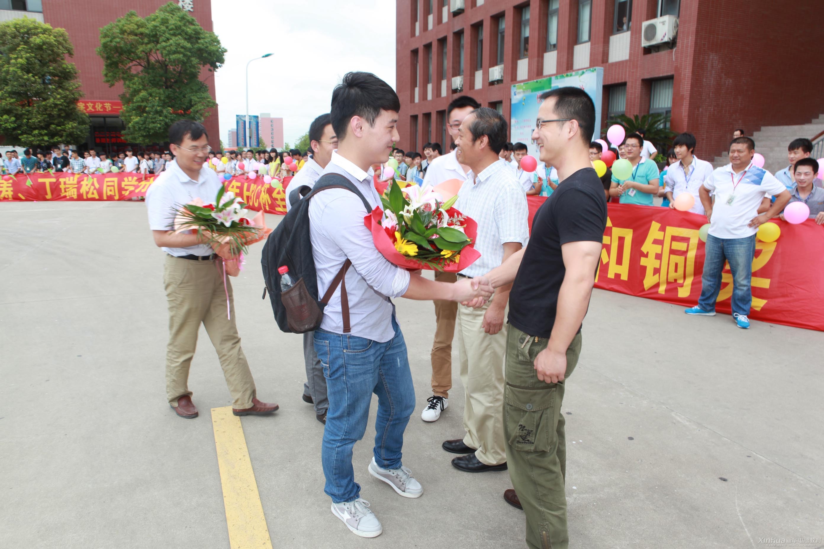 現場學子排著整齊的長隊,手持長長的橫幅以及鮮艷的彩旗、氣球,等待學子的歸來。伴隨著一陣清脆的鞭炮聲,獲獎學子張濤、丁瑞松以及帶隊老師余旭偉、姚育生從車上下來,學生代表手捧美麗的鮮花,為他們送上祝福。隨后,四位獲獎老師和學生沿著歡呼隊伍,伴隨著一路的歡呼聲,來到綜合樓前接受