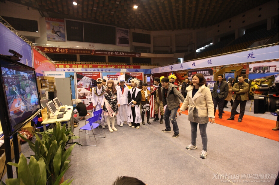 安徽新華電腦專修學院展區準備了新華學子精心編排的cosplay秀,各種炫酷的造型和個性裝扮讓來往的年輕人駐足觀賞拍照紀念,超大屏幕配備的體感游戲機讓新華學生現場歡樂互動,更有許多參觀者躍躍欲試,陶醉在逼真的游戲場景中。