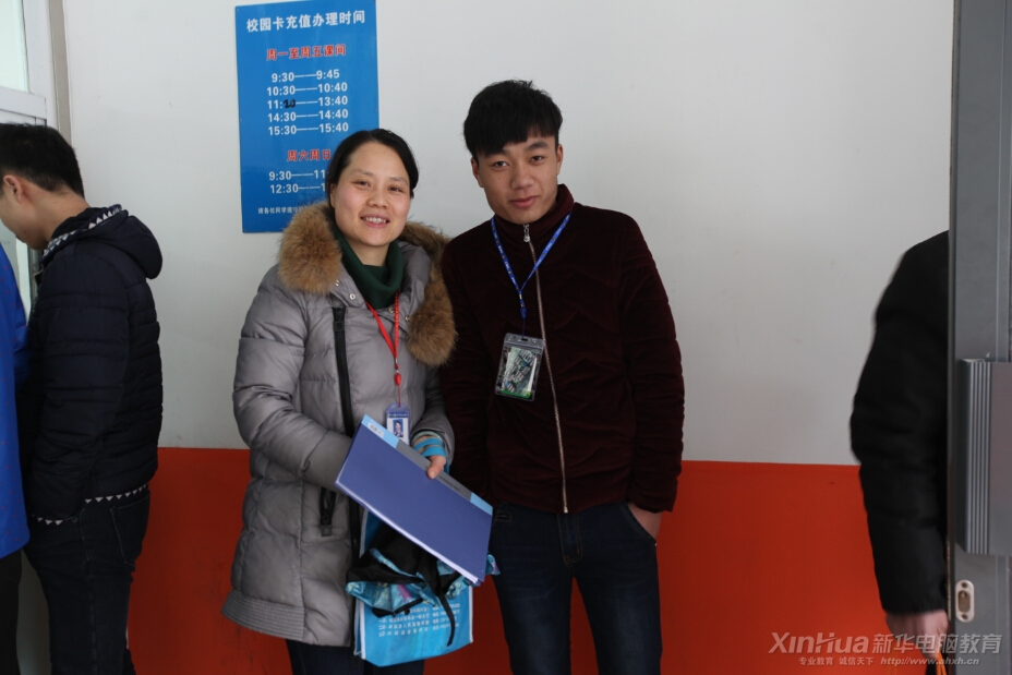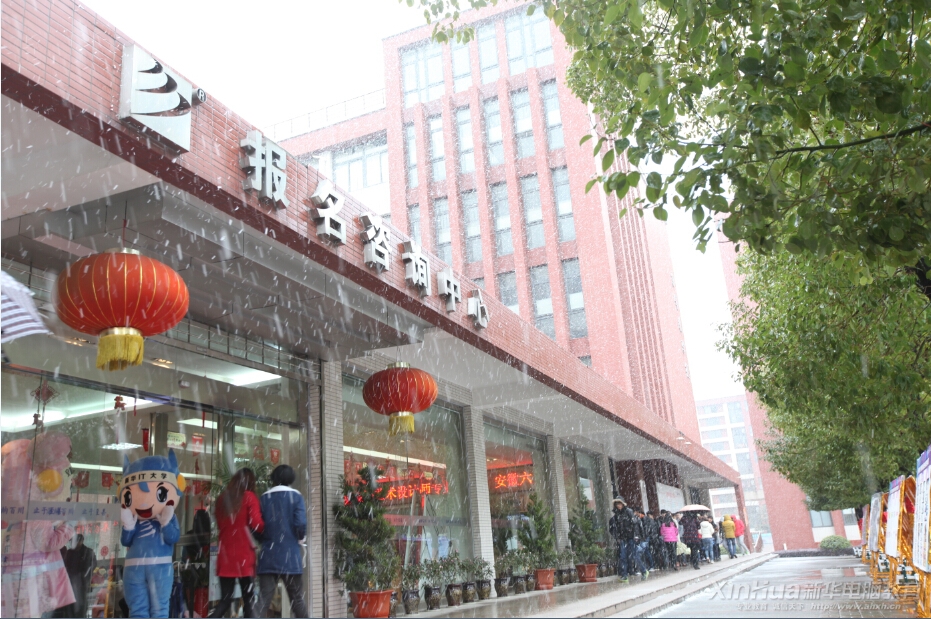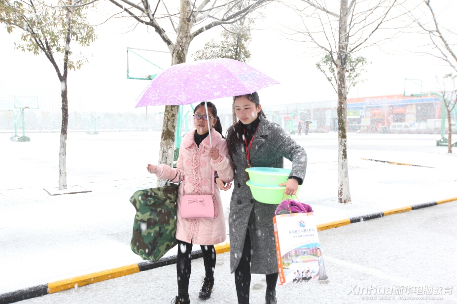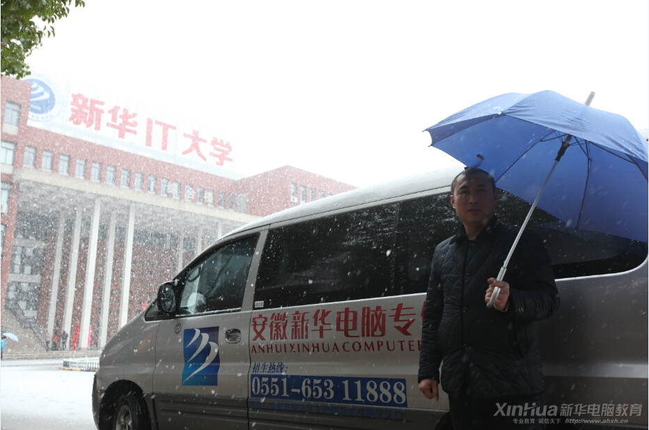 為方便學(xué)子報(bào)名,安徽新華電腦專修學(xué)院全天候開通接站車輛,為保證隨時(shí)出動(dòng),后勤老師冒雪在車旁等候