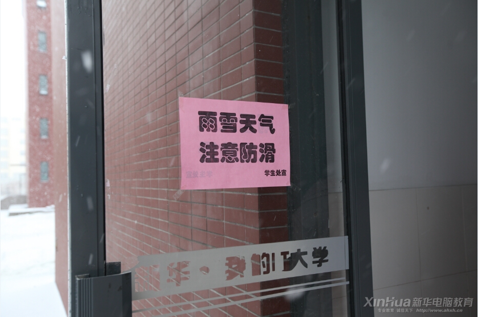 正如圖中所示“雨雪天氣 注意防滑”安徽新華電腦專修學(xué)院一直以來都將學(xué)生放在所有工作的第一位,校園內(nèi)外無不彰顯著溫情的人文關(guān)懷