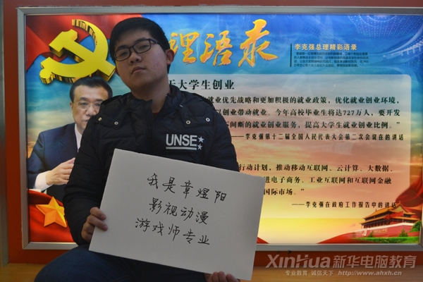 一個(gè)來自安徽安慶靦腆含蓄的小伙子章煜陽,17歲的他雖然沒有結(jié)束他的高中生涯,但他并沒有放棄對理想的追求,他從小喜歡就喜歡電腦,喜歡動漫和游戲。自己在網(wǎng)上看到安徽新華可以實(shí)現(xiàn)他的理想。在父母不同意的情況下毅然地選擇新華,后來他的父母經(jīng)過了解,同意了他的想法,并很支持他。他希望自己可以通過自己所學(xué)的專業(yè)成為一名游戲設(shè)計(jì)師。他對自己說:相信自己,只要努力,我能做到的而且比別人做的更好。