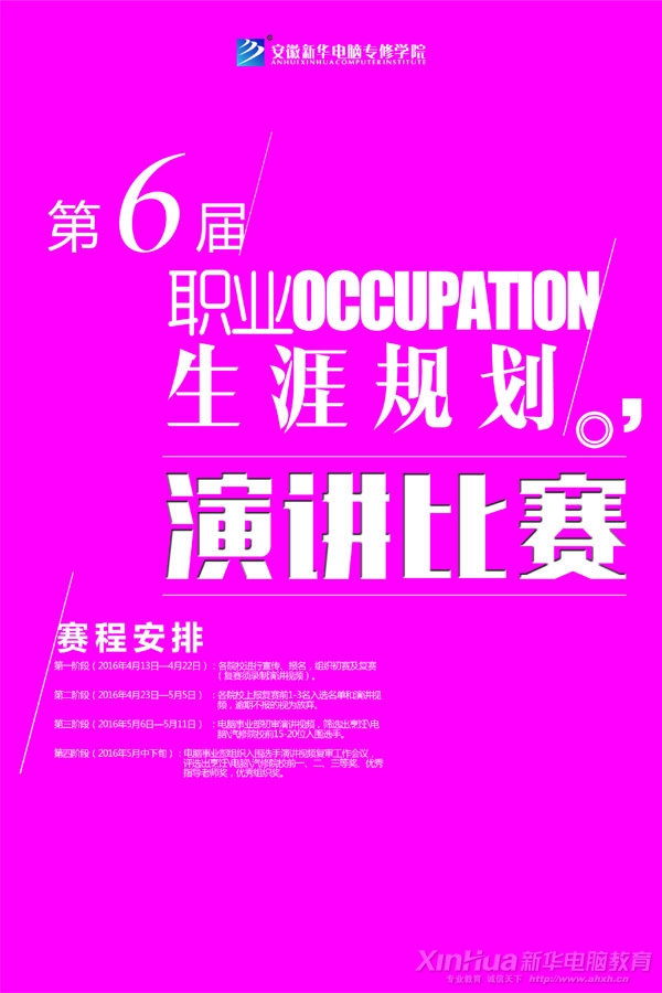 為了增強學生對職業(yè)生涯規(guī)劃的認識,提高學生職業(yè)素質,進一步推進學生更好地創(chuàng)就業(yè),經研究決定,新華教育集團第六屆職業(yè)生涯規(guī)劃演講大賽正式開賽。
