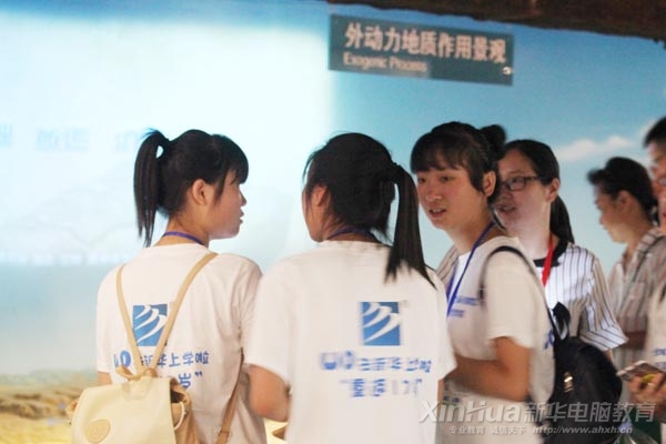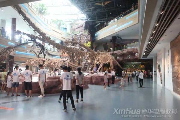 當校園巴士停下的那一刻,一棟別具一格的磅礴建筑瞬間抓住了同學們的眼球,這就是今天的第一站:安徽省地質博物館。地球廳、生命演化廳、恐龍廳、礦物巖石廳、資源與環境廳、中庭休閑區、4D科普影院、多功能學術報告廳、臨時展廳及室外景觀區,每一個廳都能看到安徽新華電腦專修學院的文化衫背影。饒是見多識廣的學生家長,此時此刻也忍不住紛紛拿出手機拍照留念。