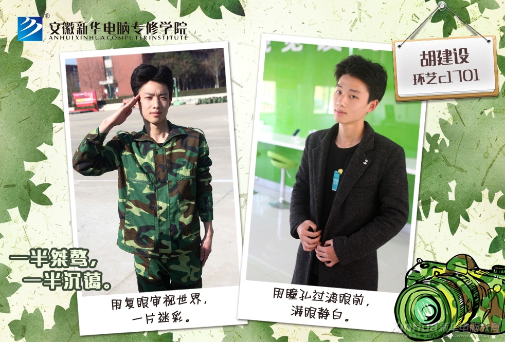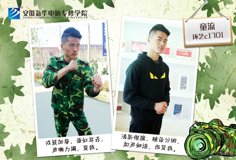 程諾說,每個人都會遇到一件事、一些人,讓你頓然明白,原來我還可以這樣。左邊是英姿颯爽的軍中綠花,右邊是呆萌可愛的現實阿拉蕾,在安徽新華電腦專修學院,我就是不一樣的我,程諾。
