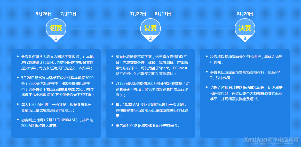 本次大賽分為初賽、復(fù)賽和決賽三個(gè)階段,其中初賽由參賽隊(duì)伍下載數(shù)據(jù)在本地進(jìn)行算法設(shè)計(jì)和調(diào)試,并通過大賽報(bào)名官網(wǎng)提交結(jié)果文件;復(fù)賽要求參賽者在騰訊DIX平臺(tái)進(jìn)行數(shù)據(jù)分析和處理,可使用基于Spark、XGBoost及平臺(tái)提供的機(jī)器學(xué)習(xí)相關(guān)基礎(chǔ)算法;決賽要求參賽者進(jìn)行現(xiàn)場(chǎng)演示和答辯。具體安排和要求如下: