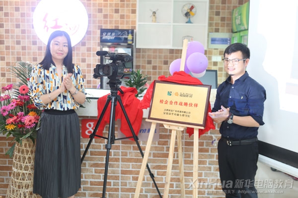 領導發言之后,整場授牌儀式走向高潮。安徽新華電腦專修學院院長助理仇楊陽和合肥橙品廣告傳媒有限公司總經理徐燦共同揭牌,正式宣布安徽新華電腦專修學院與合肥橙品廣告傳媒有限公司成為校企合作戰略伙伴。