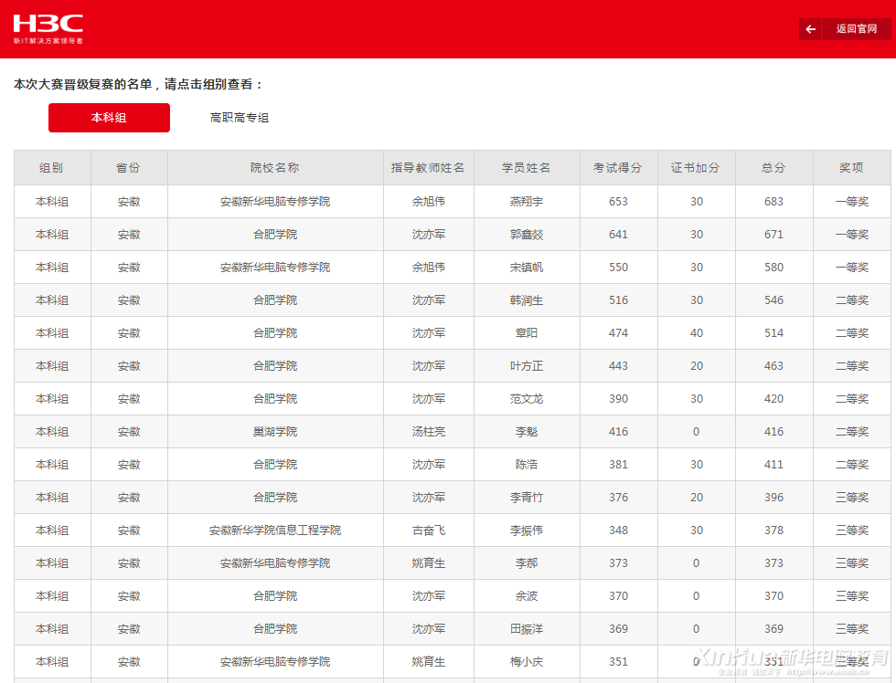 本科組的晉級名單中,安徽新華電腦專修學(xué)院的燕翔宇和宋鎮(zhèn)帆分別683和580的分?jǐn)?shù)拿下一等獎,李郝和梅小慶分別以373和351的分?jǐn)?shù)拿下三等獎。