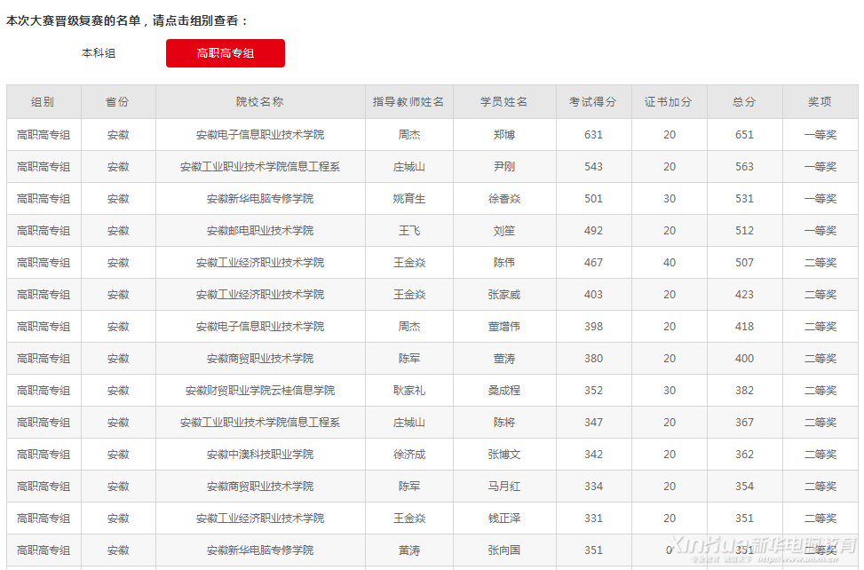 高職高專組的晉級名單中,徐香焱以531的分?jǐn)?shù)拿下一等獎,張向國以351的分?jǐn)?shù)拿下二等獎。