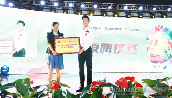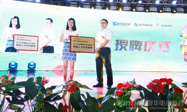之后,主辦方舉行了ACAA中國數字藝術教育聯盟創意產業人才培育基地授牌儀式,Autodesk中國教育管理中心總經理王東、ACAA教育總監鄭文分別為新華電腦教育進行授牌。新華教育集團電腦事業部副總經理徐虹、安徽新華電腦專修學院院長助理仇楊陽上臺接牌。