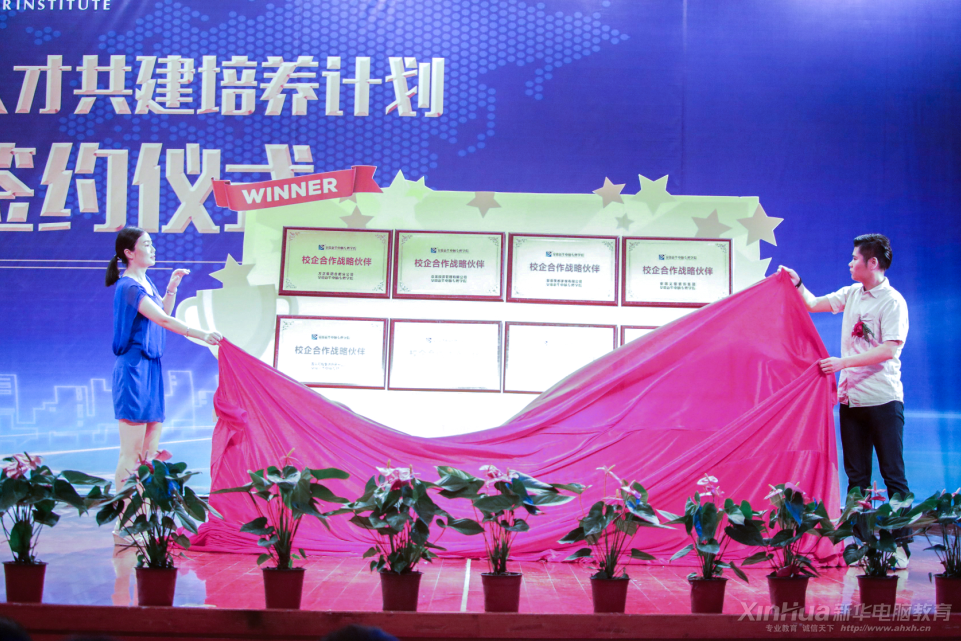 之后進入本次儀式的主要環節——簽約揭牌環節。安徽新華電腦專修學院院長助理胡德俊、眾龍投資管理有限公司總裁汪林君、安徽筑夢集團人力資源總監張銀葉、義銀裝飾集團運營副總孔龍、方正寬帶網絡服務有限公司合肥分公司總經理劉生龍、夢成控股有限公司總經理張廣榮等眾家企業的代表人上臺簽約合影。揭牌環節,安徽新華電腦專修學院院長助理仇洋、方正寬帶網絡服務有限公司合肥分公司總經理劉生龍上臺,共同為本次校企合作揭牌,共祝校企合作之路越走越好。