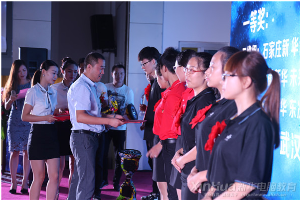 武漢新華電腦學校陳校長為一等獎的獲得團隊頒發獎杯