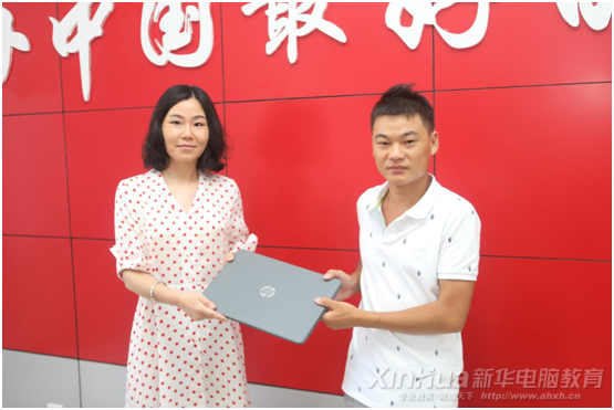 安徽新華電腦專修學院院長助理仇洋代表學院向周福送去筆記本電腦