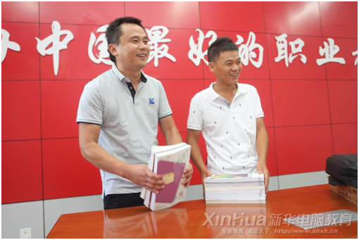 安徽新華電腦專修學院院長助理胡德俊代表學院向周福送去課本
