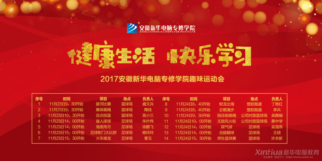 冬天的腳步和充滿熱情的運動會,總是缺一不可的。而同學們在越來越寒冷的日子里卻逐漸躁動起來,在同學們的千呼萬喚之下2017年度師生校園趣味運動會即將到來了。在23日到24日中,安徽新華電腦專修學院將進行一場青春與熱血碰撞的盛會,廣大學子將在運動場上揮灑汗水一爭高下,在這里你可以盡情展現自己的英姿颯爽,你也可以盡情揮發你的熱情。讓你在新華電腦專修學院的每一天記憶都銘記,讓你在競爭中超越對手,超越自我。來吧,快來參加這個屬于你的青春盛宴,在新華電腦學院的塑膠跑道上,留下屬于你自己的汗水吧。