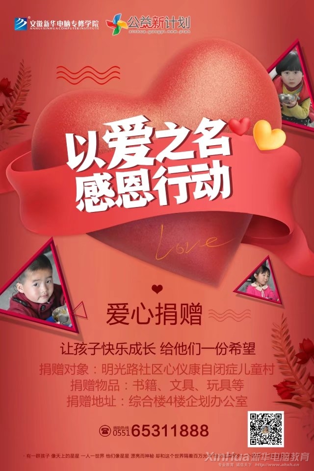 一個個愛心從人群里凝聚,一張張笑臉也會在孩子們的臉上綻放。在你享受春天的甜美時,總是有人在刺骨的寒冬,他們有時只是需要一個小小幫助,親切的擁抱和溫暖的笑容,讓我們獻出自己的愛心,給那些孩子們送去屬于自己的溫暖吧。安徽新華電腦專修學院致力于培養多方面優秀人才,在學歷加技術的基礎上更加注重個人素質和成人功德上的培養,做到讓在校學子先成人再成才,從而學會在社會上更好的發揮自己的光與熱。從而做到技術上的強者,人格上的精英者。