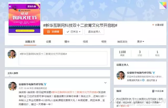 12月6日,帶話題#新華互聯(lián)網(wǎng)科技 “雙十二”教育文化節(jié)開(kāi)啟啦#發(fā)送,微博用戶帶話題#新華互聯(lián)網(wǎng)科技 “雙十二”教育文化節(jié)開(kāi)啟啦#并@3位好友,即可參與抽獎(jiǎng),從關(guān)注中抽3個(gè)人送100元話費(fèi),抽8個(gè)人送50元話費(fèi),抽15個(gè)人送30元話費(fèi),12月12日晚上8點(diǎn)在@微博抽獎(jiǎng)平臺(tái)開(kāi)。