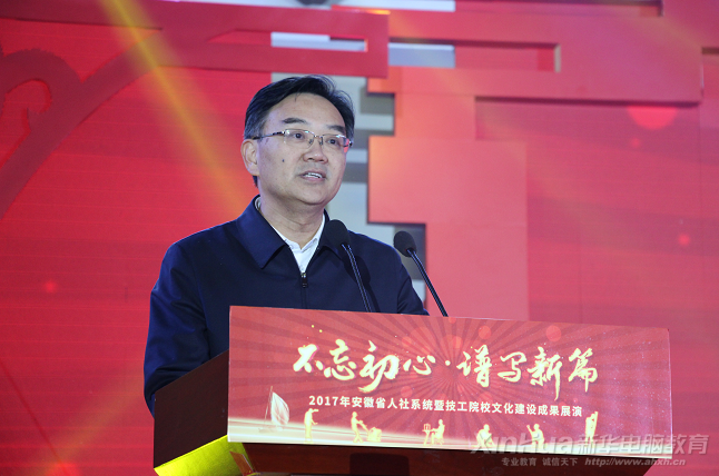 隨著倒計時的畫面一步步結束,晚會也在激昂的音樂中正式開場。在熱烈的掌聲中,省人力資源和社會保障廳黨組成員、副廳長、機關黨委書記劉少華為本次展演致辭。劉少華副廳長表示:近年來,全省人社系統干部職工牢牢把握五大發展理念,始終堅持以民生為本,人才優先的工作主線,全省技工院校的改革步伐明顯加快,呈現出規模不斷擴大,結構持續優化,層次穩步提升的良好開始,這次人社系統暨技工院校文化建設成果展演必將讓人社系統和全省技工院校走向新的階段。