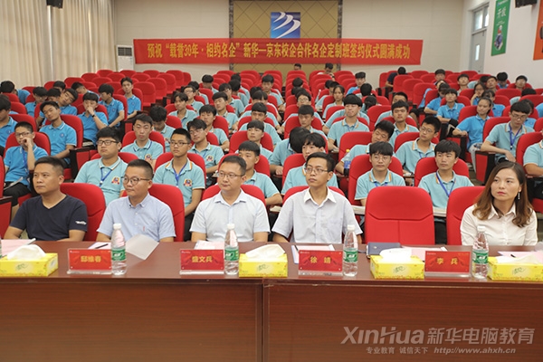 安徽新華電腦專修學院與京東校企合作定制班的簽約儀式在五號樓學術報告廳隆重舉行。京東物流安徽區人力資源部負責人徐靖、京東物流安徽區校企合作經理邸維春、京東物流安徽招聘經理錢燕春、