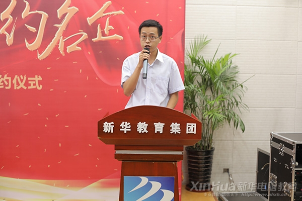 在熱烈的掌聲中,安徽新華電腦專修學院校區負責人為本次儀式致辭,他表示,與京東簽訂校企合作協議,開啟“定向班”教學模式,代表我院與京東的合作進入了新的起點,開啟了新的里程。更標志著安徽新華“產教融合、共贏未來”的決心。希望我院學子珍惜此次機會,及早定下自己未來的職業規劃,為高薪工作打下良好的基礎。