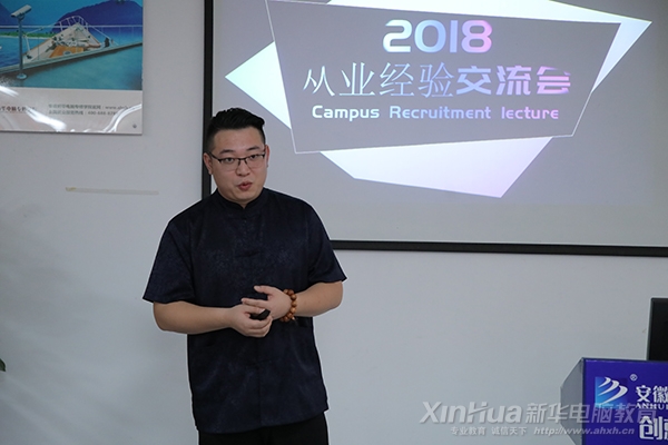 安徽新華電腦專修學(xué)院創(chuàng)就業(yè)指導(dǎo)中心學(xué)生就業(yè)指導(dǎo)課面授廳。學(xué)院14年電子商務(wù)專業(yè)畢業(yè)的杰出校友楊志龍給學(xué)弟學(xué)妹們分享自己的就業(yè)、創(chuàng)業(yè)經(jīng)歷。