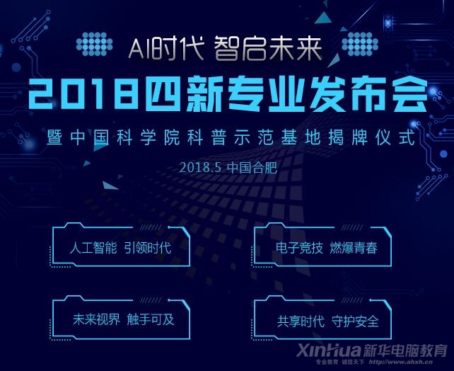 2018年5月17日,多名科技界、產業界、教育界著名學者、頂級專家和業界精英將匯聚創新之城中國·合肥,新華互聯網科技將舉辦《AI時代 智啟未來 2018新華互聯網科技四“新”專業發布會暨中國科學院中國科普博覽示范基地揭牌儀式》,該活動由新華互聯網科技聯合中國科學院共同舉辦,中國互聯網協會和中國職業技術教育協會等專業協會指導,科大訊飛、華為、百度、直尚電競等多家品牌企業參與,共同見證新華四大王牌“新”專業的發布,還將共同見證新華互聯網科技正式揭牌成為中國科學院中國科普博覽示范基地。