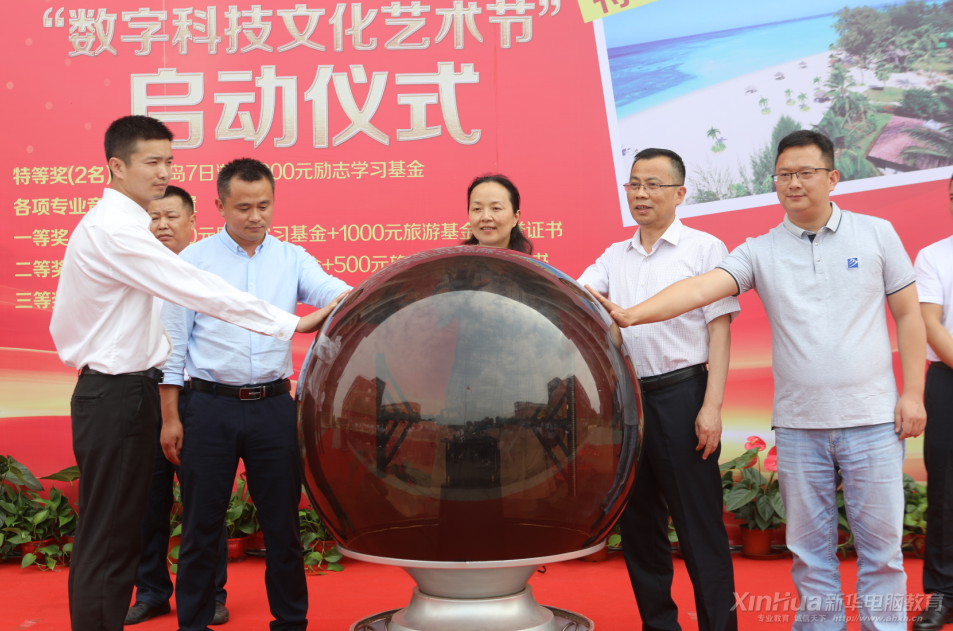 啟動儀式在高亢激昂的鼓聲和舞蹈中拉開序幕,學校的領導在炎熱的天氣中以最高漲的熱情宣讀著啟動儀式致辭,教師代表和學生代表的發言也并沒有因為面前擁擠的人群而露怯。隆重的致辭發言環節后,安徽新華電腦專修學院院長束凱鈞、合肥職工科技大學繼教處處長王穎等領導齊齊上臺,當領導們手掌齊齊觸上啟動儀式球的那一剎那,安徽新華2018年“千人創業培訓項目”暨第十四屆職業校園“數字科技文化藝術節”正式啟動!