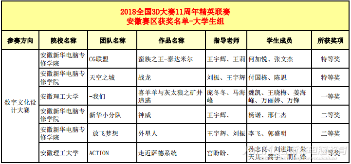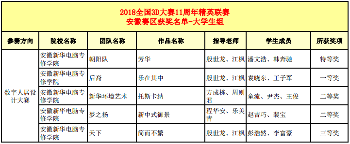 參賽作品水平不斷提升,涌現出了一大批優秀設計作品與團隊,并快速成長為行業新銳與翹楚, 備受業界關注。在剛剛結束的2018全國3D大賽11周年精英聯賽中,安徽新華電腦專修學院動漫專業學生榮獲安徽賽區2個特等獎、1個二等獎,安徽新華電腦專修學院環藝專業學生榮獲1個特等獎、1個一等獎、 2個二等獎、 1個三等獎。