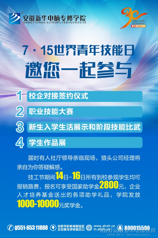 為了積極響應(yīng)國(guó)家號(hào)召,進(jìn)一步營(yíng)造勞動(dòng)光榮、技能寶貴、創(chuàng)造偉大的社會(huì)氛圍,鼓勵(lì)更多青年走上技能成才之路,安徽新華電腦專(zhuān)修學(xué)院將于本月15日的“世界青年技能日”同步舉行校園開(kāi)放日活動(dòng)。據(jù)悉,屆時(shí)將有校企對(duì)接簽約儀式,職業(yè)技能大賽,新生入學(xué)生活展示和階段技能比武,在校學(xué)子設(shè)計(jì)比賽總決賽等豐富多彩的活動(dòng)。