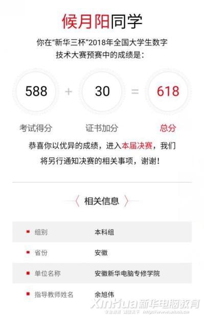 安徽新華電腦專修學院連續多年參與新華三全國大學生數字技術大賽,并成績斐然。今年我院網絡工程專業學生侯月陽以618分的成績成功晉級2018年H3C本科組總決賽,金嚴同學以477分的好成績成功晉級2018年H3C職業組總決賽。