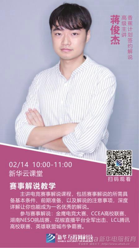 2019年2月14日,《新華云課堂》即將上線香蕉計劃簽約解說蔣俊杰老師,來為電競學院的學子講解:賽事解說教學。
