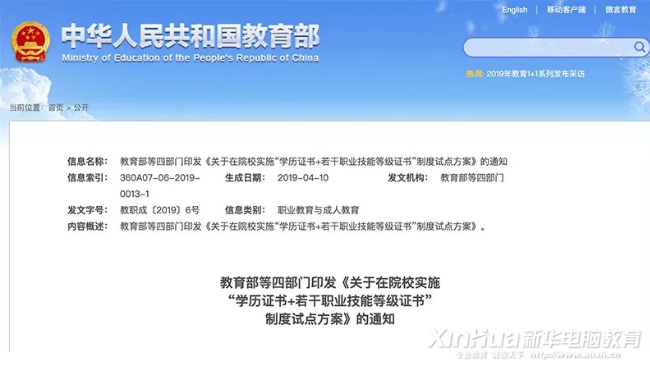 根據(jù)國(guó)務(wù)院發(fā)布的《國(guó)家職業(yè)教育改革實(shí)施方案》,從2019年開始,在職業(yè)院校啟動(dòng)“學(xué)歷證書+若干職業(yè)技能等級(jí)證書”制度試點(diǎn)工作。